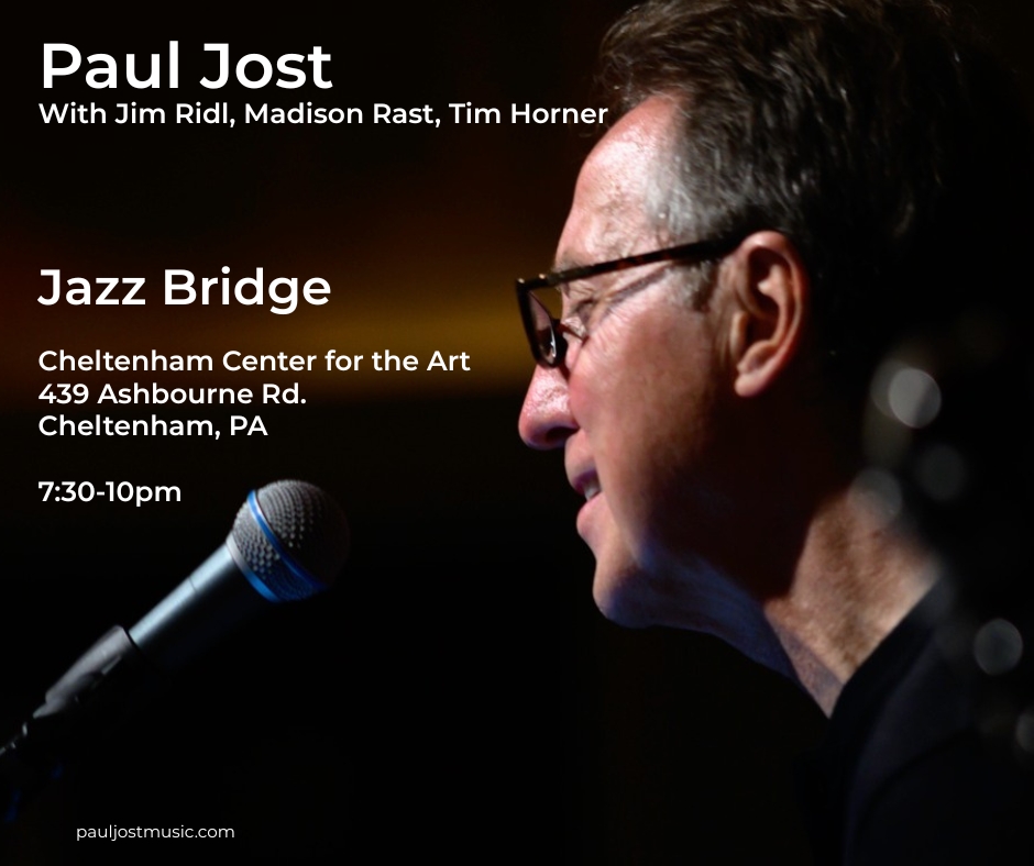 Paul Jost – with Jim Ridl, Tim Horner, MADISON RAST – (Cheltenham, PA) December 3, 2025 7:30 pm Jazz Bridge Paul Jost-Vocal/Harmonica Jim Ridl-Piano Madison Rast-Bass Tim Horner-Drums 7:30PM – 9:30 Cheltenham Center for The Arts 439 Ashbourne Rd, Cheltenham, PA 19012